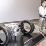 現場に置かれた写真を見るにホイールの間にロータリーエンジンが置かれる。しかしシャフトがなく、結局のところはエンジンの駆動を直結させるかなどは不明。まさに「匂わせ」という感じだが、マツダとしては発電だけなんてことはなく、しっかりエンジンとしての存在感も出したいとこだろう。