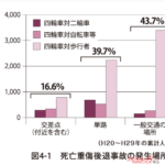 また軽傷事故では単路が41.9%、一般交通の場所が36.4%と、一般交通の場所でも四輪車対歩行者の事故が極めて多いことは死亡事故と同じ傾向だ。