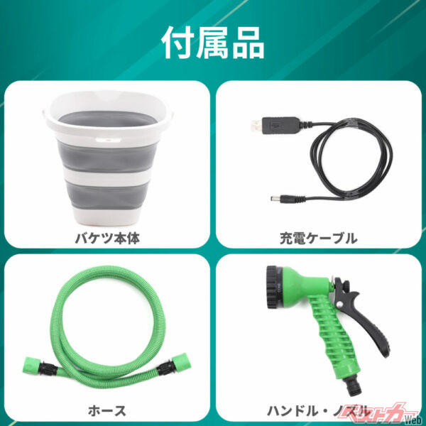 付属品:ポータブル洗浄機バケット×1、ノズル×1、ホース×1、充電ケーブル×1