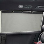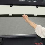 ロールカーテンシェードはリアドアウィンドウ用の左右セット。必要な時は引き上げて2カ所のフックに掛けるだけで直射日光を効果的に遮断し、車内の快適性をキープできる。