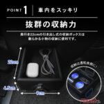 奥行22cmの引き出し式収納を備え、スマホアクセサリーや小物をすっきり整理できます。この引き出しは運転席側に配置されているので、ドライバーにとっても取り出しやすく、使い勝手も抜群。見た目だけでなく、実用性もしっかり考えられた構造です。