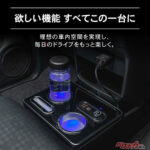 そして本製品最大の特徴のひとつがLEDライト。LED付きコンソールボックスは同社の定番商品と言ってもいいほどです。ワンプッシュで点灯し、3段階の明るさ調整が可能。夜間の荷物確認や車内照明としても機能し、青く光るカップホルダーがドライブシーンを幻想的に照らします。