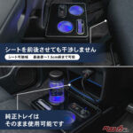 設置は簡単で、助手席側から中央にスライドさせるだけ。車体への加工は不要で、純正トレイやシートの可動もそのまま利用可能です。インテリアに馴染むデザインで、装着直後から快適な空間を演出します。