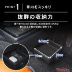 ハイエースのセンターコンソール周りは、日常使いの細かい荷物が集まりやすい。同製品は奥行き19cmの引き出し式収納を備え、財布・スマホ・常備薬・ケーブルなどを「とりあえず放り込む」だけで整理できる。