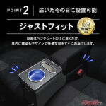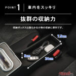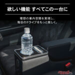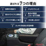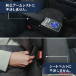 座席の隙間に製品を差し込み、アームレストを倒すだけで設置が完了する簡単構造で、純正アームレストやシートベルトに干渉しないのが、うれしい特徴です。設置後はコンソールとして一体感のある見た目になり、車内の印象を崩しにくい点もポイント。