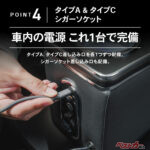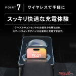 USBタイプAとタイプCを各1口ずつ備え、加えてシガーソケットの差込口も完備。スマートフォンや各種デバイスの充電を1台にまとめることができます。カップホルダー付近にはワイヤレス充電機能を備えた口が備わっていますが、非搭載の仕様も用意されています。