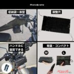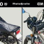 MotoBrellaは、車体全体ではなく上側だけを覆う平面構造のカバー。ハンドルに固定して使うことができ、なんと装着は40秒、収納は70秒でできてしまうとのことだ! 収納袋は一体型で、持ち運びやすさにも配慮している。位置を変えられる調整穴を備えているから、さまざまな車種に対応する点も特徴だ。