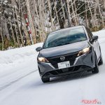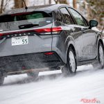 こういった状況でスタッドレスタイヤのテストを行うと、案外タイヤのパターンが大きな要因になったりする。タイヤテストとしちゃ楽しいし、絵柄も派手な横滑りになったりするなど映えるけれど、優れたスタッドレスタイヤかどうかの判断基準にはならない。圧雪はけっこうグリップがよく、テストコースだと180km/hのリミッターに当たることも。