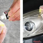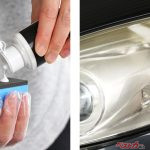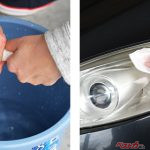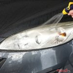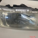 施工する前に、あらかじめヘッドライトの汚れやホコリなどをキレイに洗い、水滴を拭き取る。コーティング施工をしている場合は除去する必要がある。