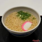 麺やおあげが乗っている状態の出汁は薄い茶色の関西風に見える。味もすっきりしており、朝7時でもぺろっと食べられる。麺も角が少し丸い感じで、喉越しで味わえる柔らかさだ。麺をすべて食したあとの出汁は少し黒目だが、すっきりとした味わいで、関東風の黒いうどんを想像していただけに、出鼻をくじかれた思いだ。