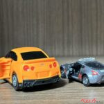 はじめてトミカのGT-Rと、我が家にある通常のトミカ(フェアレディZセーフティカー)を比べていく。