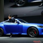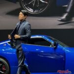 会場でCMが流れた後、会場左側から幕が上がり、ワンガンブルーのフェアレディZが会場中央に現われた。ドアを開けて降りてきたのは日産の新ブランドアンバサダーに就任した鈴木亮平さんだ。ビシッと決まった、ワンガンブルーZに合わせたスーツで颯爽とクルマを降りた姿がキマっている。