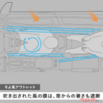 フロント左右に配置された「そよ風アウトレット」は、乗員を包み込むような風の膜を作り出す。体に直接当たることなく穏やかに頰を撫でる風は、外気の熱や寒さを軽減する役割も果たす