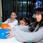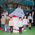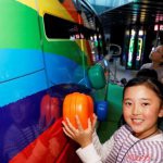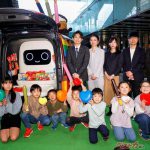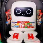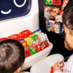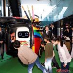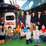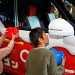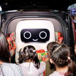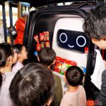 そして2代目グリコワゴン車内のハイライトが、リアゲートに仕掛けられたコミュニケーション用の大きな顔のディスプレイだ。この顔が子どもたちの会話に反応して表情が変わるようになっており、両手で差し出すように子供たちにお菓子を渡すようになっている。