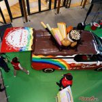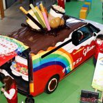また、外観デザインで特徴的なのは何といってもルーフ部に設置されたグリコ商品の数々だ。ジャイアントコーンやビスコにポッキーなどのほか、アーモンドやキャラメル、チョコレートがあふれんばかりに盛られている。