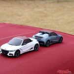 杉尾さんによれば、第一弾の「ネオクラシックレーサー」と第2弾の「S660 Modulo X」のいずれもMINI-Zとしての戦闘の高さも魅力だという。その秘密は、前後のオーバーハングが極端に短いこと。写真で見比べてみると、同じシャシーを使うホンダNSX(2代目)と比較しても、前後が短いことが分かるだろう。無駄な重量物が前後にないため、より小回りが利くだけでなく、より機敏な動きも可能なのだ。