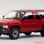 1986年8月に発売された初代テラノは、D21型ダットサントラックをベースとするSUV。登場時は2ドアモデルのみがラインナップ。本場カリフォルニアで当時人気だった「2ドアのSUV」という基本形状を採用し、各部をフラッシュサーフェス化したうえで、サイドの中央にはユニークな三角窓を設置した。