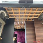 胴縁の上に厚さ4ミリのベニアを張って天井にした。最終的にはここに防炎クロスを張って仕上げる予定。キャンピングカーとして改造申請するから、このあたりはチェックされるからだ。