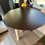 テーブルは自宅にある板で作ったら奥行きが足りず、運転席反転させてもちょっと遠かったので、天井で使った4ミリ合板の余りを丸くカットして、もともとあるテーブル板の上に貼って、表面は木目のカッティングシートを張り込んで、インテリアと雰囲気を合わせた(あくまで仮設)。