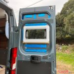 自宅に戻ってきてから、リアドアに窓取り付けと断熱を施した。まず窓を取り付ける位置を決めて、残った部分に制振材を貼ってから断熱材を貼り込んだ。