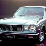 ジャガーXJを彷彿とさせる英国車風デザインの3代目コロナマークII。トヨタオート店では兄弟車、チェイサーが販売された。「堅気になろう三代目」という開発コンセプトは意味がわからない……。