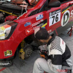 ダイハツのサービスピットには当然ダイハツの名が刻まれたサービスマンがたくさん。そんな中に日産のツナギがあるのには、かなり不思議な光景である。