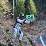 上がるとちょうど同業者の竹岡圭さんが通り掛かる。路肩からにょっこり出てきた人を見て驚いたんだと思う。止まってくれました。やさしい。コ・ドラの山田さんから「大丈夫ですか?」と声を掛けられる。OKサインを出して「大丈夫です!」。そこからヘルメット被ったまま、後続車すべてにOKサインを出す。ラリー業界じゃ「踊る」と言います。