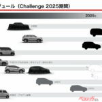 モメンタム2030のシルエット画像は、2023年秋に開催されたジャパンモビリティショー2023で披露された「D:X コンセプト」と思われるモデルが中心に据えられている。D:X コンセプトは同社の「デリカD:5」の未来をイメージした電動クロスオーバーMPVだとされており、メカニズムは電動4WDシステムにPHEVという組み合わせで、オンロードでもオフロードでも、あらゆる路面状況での安定した走りを提供するため、繊細な四輪駆動制御技術が採用されるという。