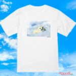 写真を見てください! 「アザラシの赤ちゃん」(上写真・)と「シマエナガ」(下写真)が美しくプリントされたTシャツで、現在販売中!