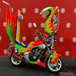 大阪オートメッセならではといえば、「族車」バイクの展示。アップハンドル・三段シート・集合管、ロケットカウルが3mはあろうかという、天を衝くくらい高く装着されたバイクが展示されているではないか? いわゆる「ぶち上げ仕様」というやつで、6連ラッパも装着された「フル装備」にお客さんは実際にまたがって記念撮影するほどの大人気。