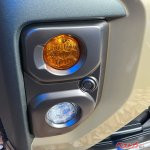 まず、前述のバンバー両サイドのフォグランプベゼルはこのままギアになる。そこに挟まれたハニカム模様の黒色ロアグリルもそうで、上部2カ所に超音波センサーが付いている。また、両者が付いているフロントバンパー全体もまずギア専用でフォグライト部分がエラのように大きくエグられている。
