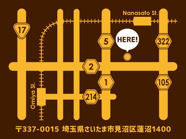 お車で来店のお客様は東北自動車道「岩槻インター」から10分。首都高速埼玉大宮線「さいたま見沼」より15分となります。電車で来店は東武アーバンパークライン「七里駅」よりご連絡頂ければお迎えにあがります。